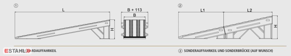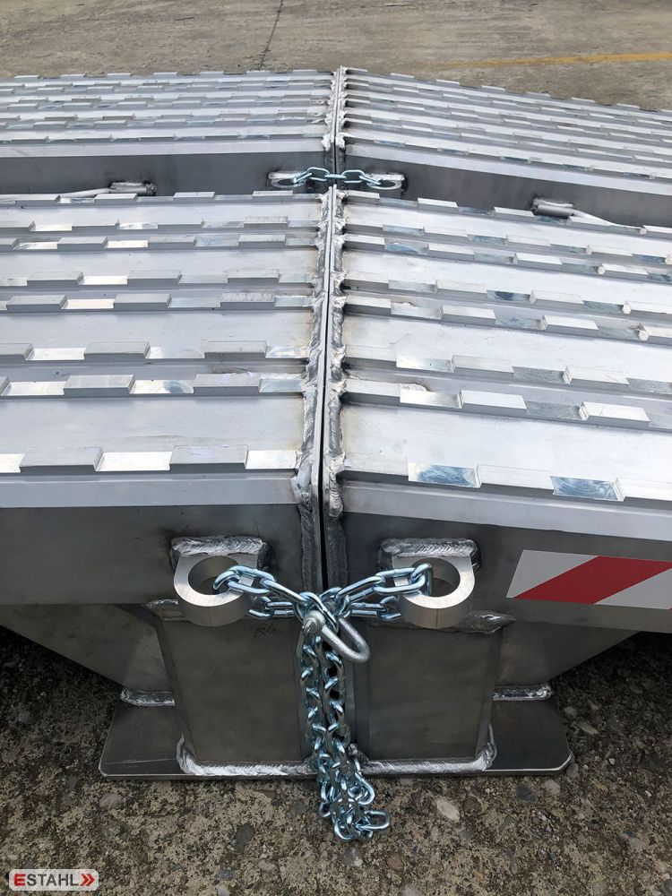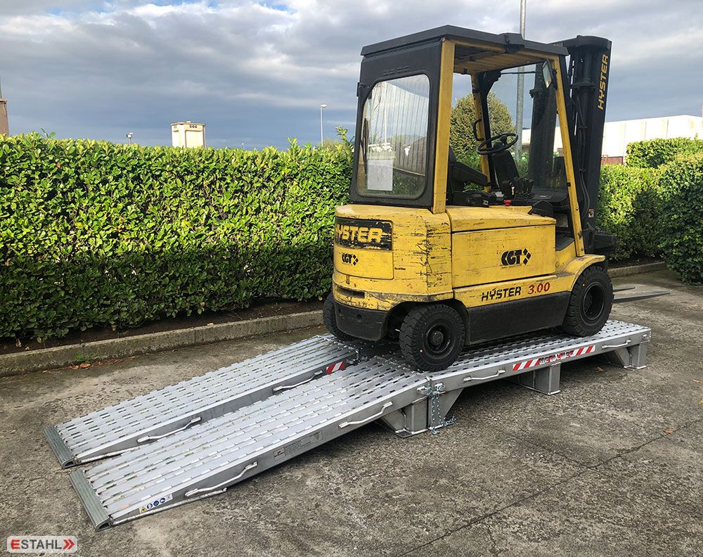 Das Verladesystem Auffahrkeil mit Brücke, aus gefrästen Profilen mit hohen mechanischen Eigenschaften hergestellt, ist die ideale Lösung zur Überwindung von kleinen Höhenunterschieden mit Fahrzeugen mit hohen konzentrierten Lasten. Der Auffahrkeil kann einzeln genutzt werden oder durch die Verwendung einer Brücke verlängert werden, um Höhenunterschiede bis zu 500 mm zu überwinden. Das System ist mit Sicherungsringen versehen, um die Struktur zu befestigen durch die Ketten und Aluminiumgriffe, die das Bewegen der einzelnen Bestandteile vereinfachen.