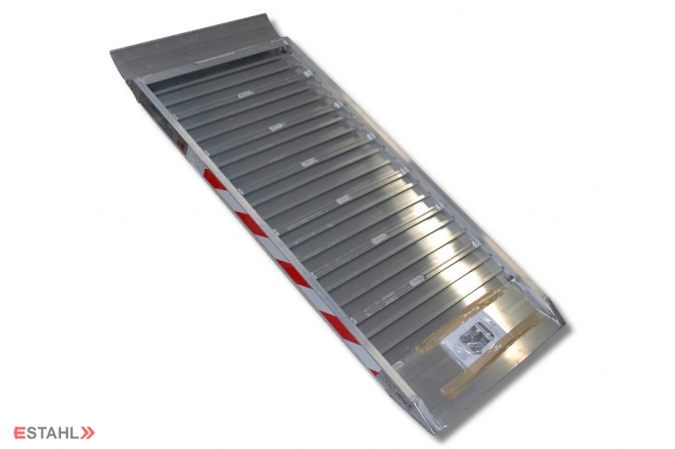 Die Befestigung der Rampe wird durch einen Aluminium-Bügel (siehe Bild) erreicht, der zwischen Ladebordwand und -boden eines Anhängers eingehakt werden kann. Der Bügel kann flexibel unter der Rampenschiene seitlich ein- und wieder herausgeschoben werden. Gegen ungewolltes Herausrutschen wird der Bügel mit 2 Plastikkappen gesichert.