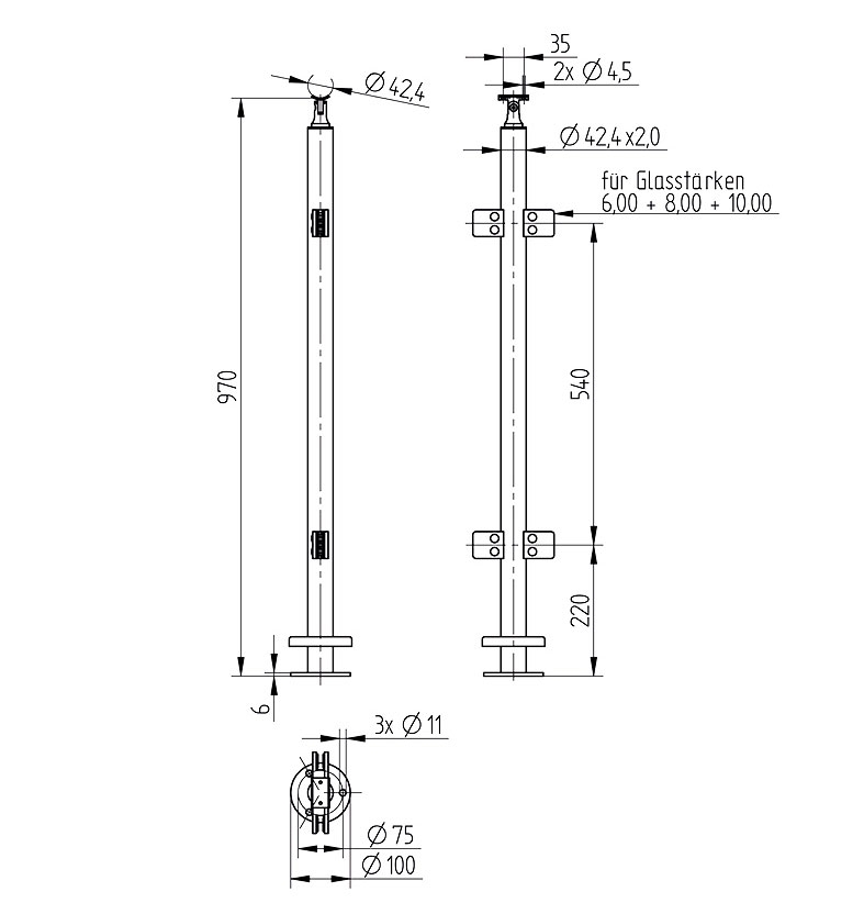 Produktinformationen "V2A-Geländerpfosten zur Bodenmontage mit 4 Glashalter"